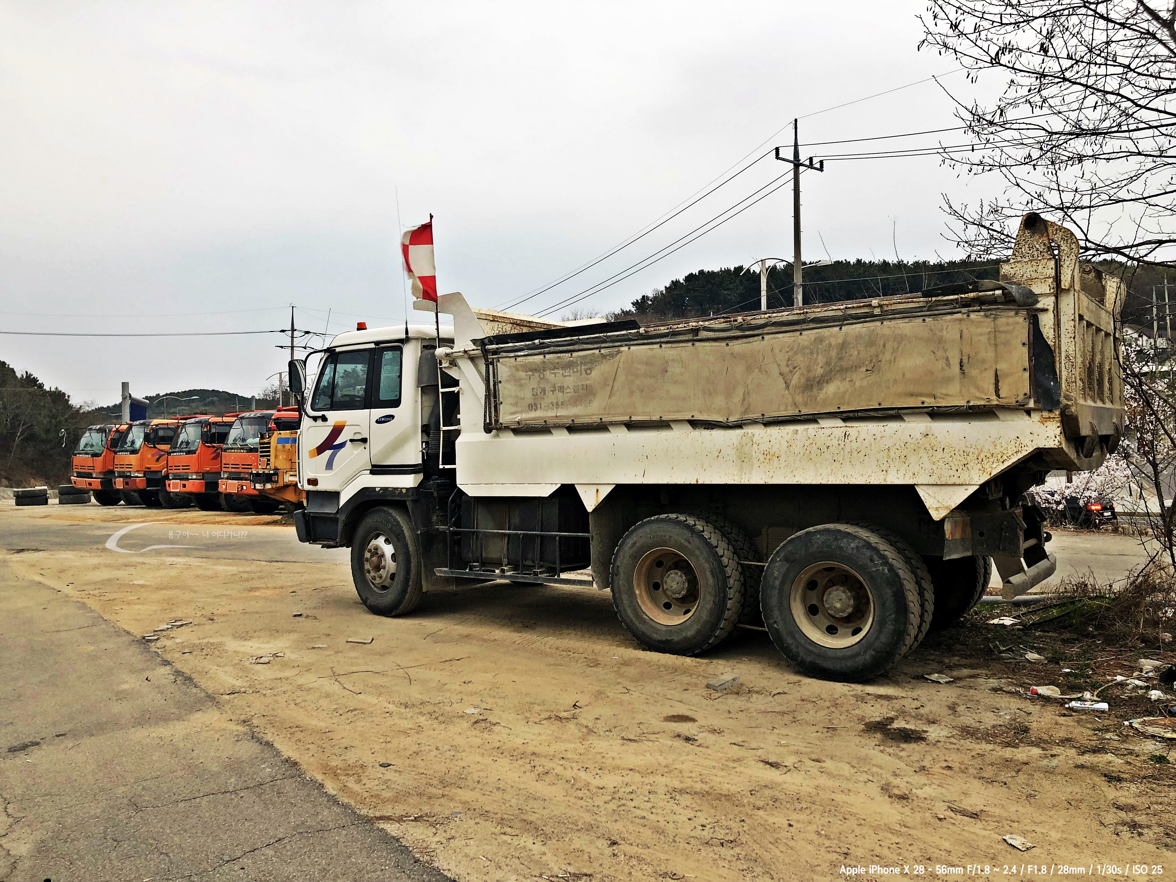구읍뱃터 갔다 온 뒤 집으로 돌아가던 중 대형트럭 정비소 앞에 주차 중인 삼성 덤프트럭 5대가 있었다.