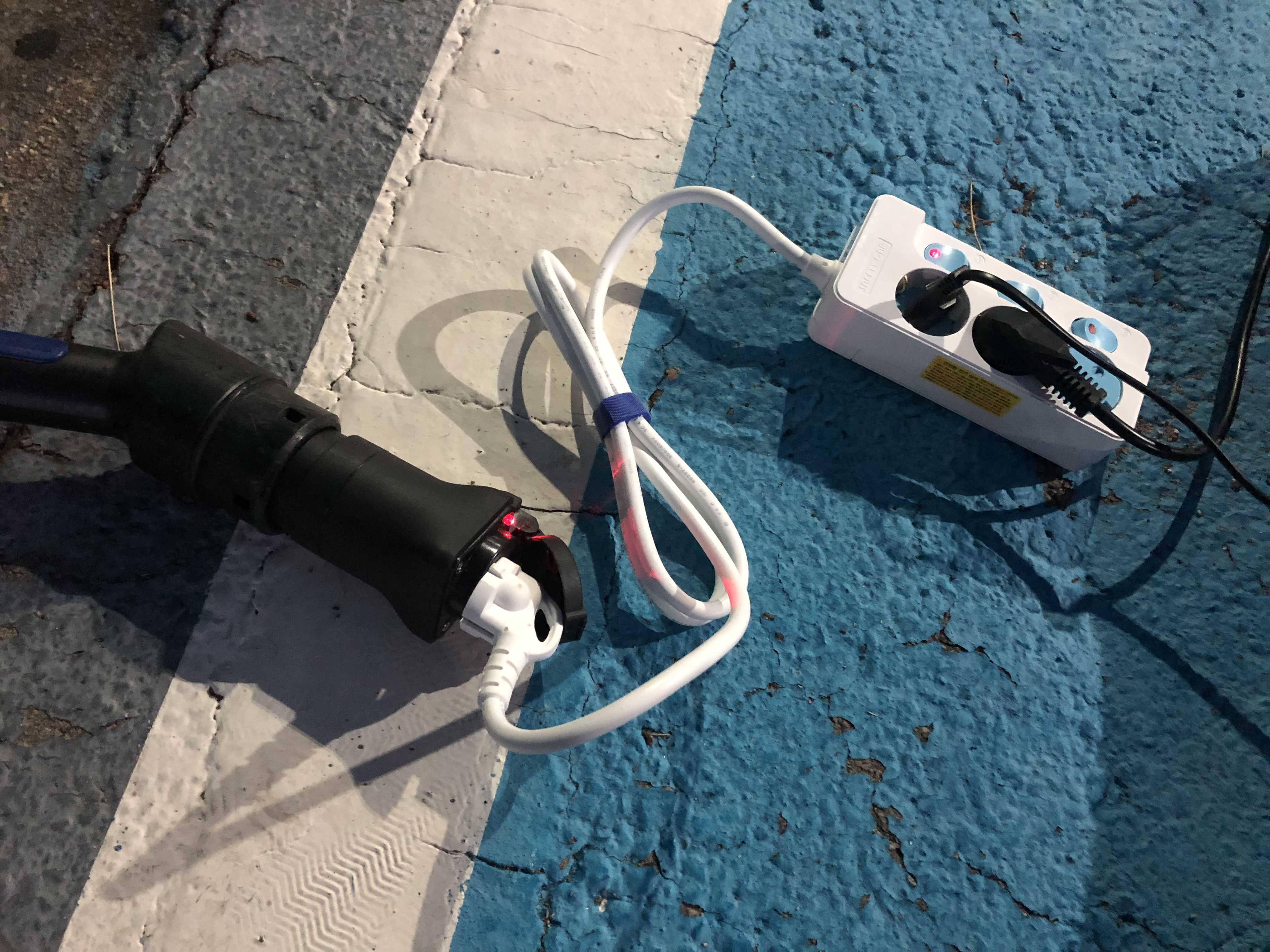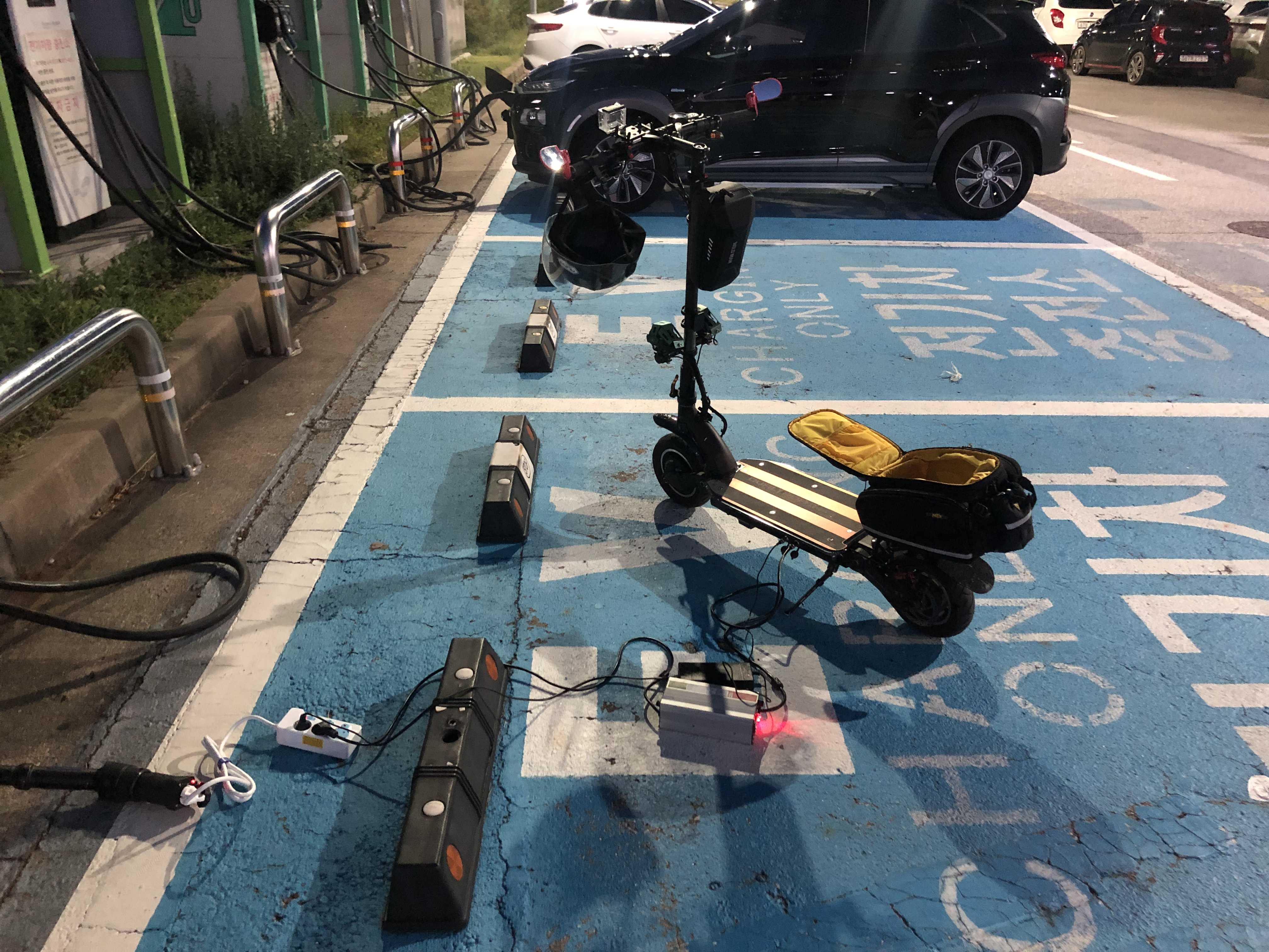 AC3상 7핀 to 220v 젠더 해외 구입한 지 나흘 만에 전기차 충전소에서 전동킥보드를 시험삼아 충전 중이다.
