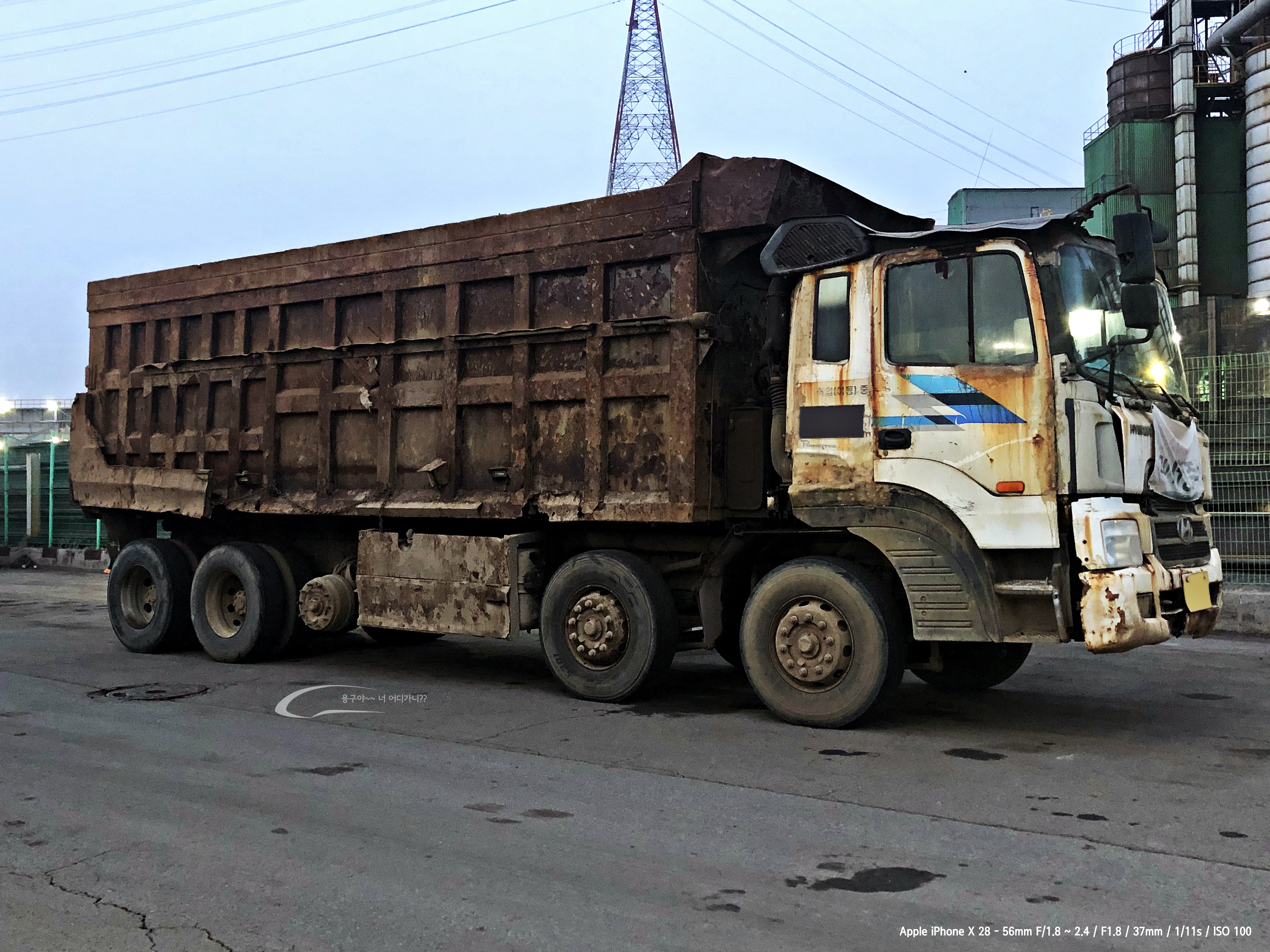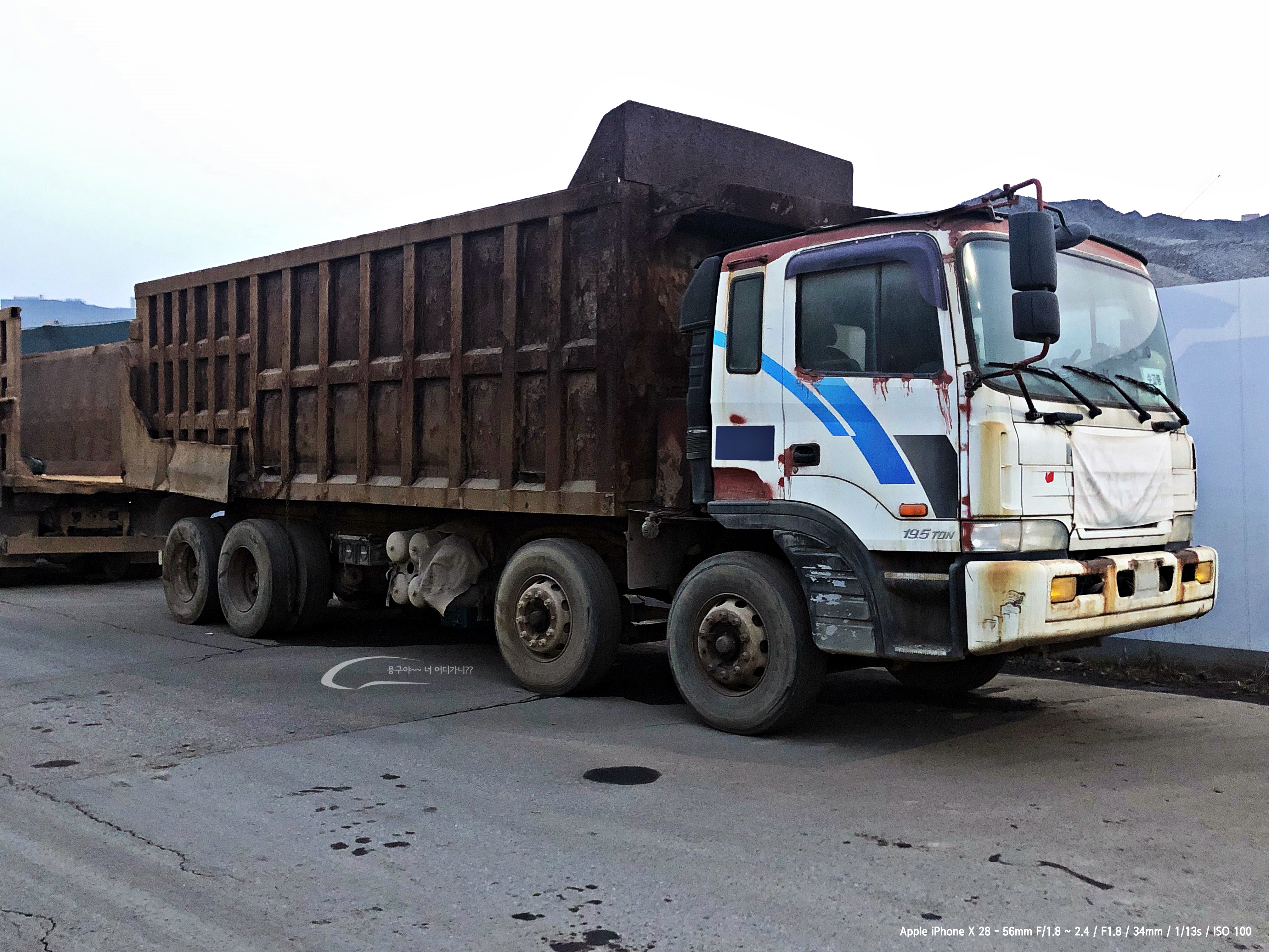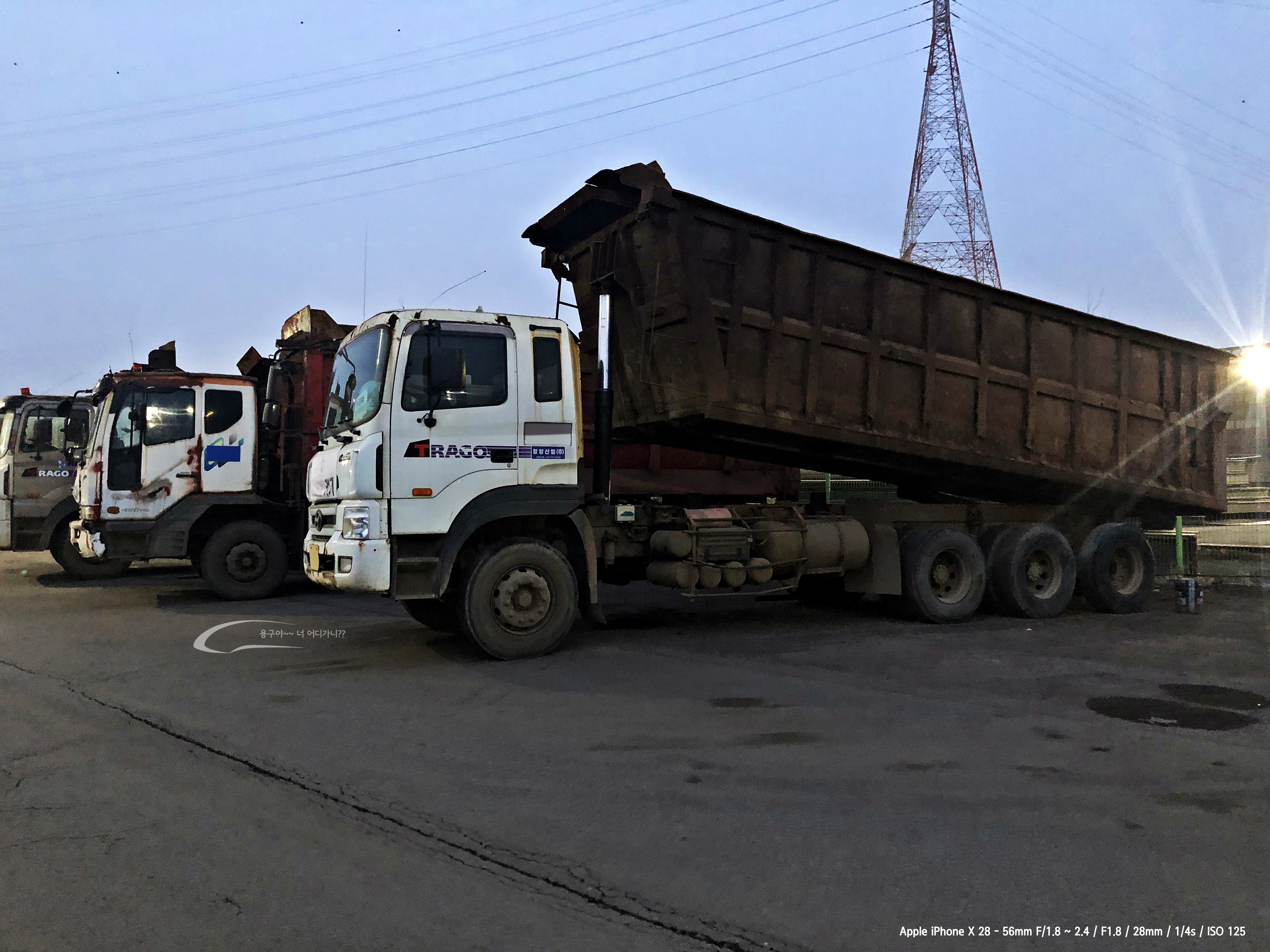 인터넷 지도 거리뷰 사진같이 북항 고철부두와 제철소 왔다갔다 운반하는 고철전용 트럭들이 고철을 싣고 쏟고 반복하니까 적재함은 이미 걸레짝이 되고 캡이 고철에 긁히고 찌그러지니까 상태가 걸레짝이 되었다.